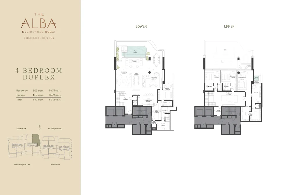 The Alba Residences Dorchester Collection offers 209 exclusive homes on Palm Jumeirah. Options include super penthouses and 3 or 4-bedroom simplex and duplex residences.